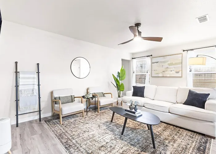 The accommodations at Family-Friendly 3Br 10 Min From AT&T Stadium are thoughtfully crafted to ensure a relaxing stay. Each of the three well-appointed bedrooms is designed with your comfort in mind, featuring cozy bedding, spacious storage, and plenty of natural light. Additionally, the open-concept living area invites families to gather and enjoy quality time together, showcasing a well-equipped kitchen that caters to all culinary desires.
